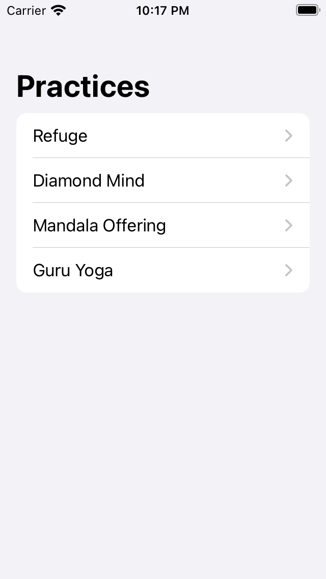 I have applied the lessons learned from the tutorial to my side project, Ngöndro Tracker. As a reminder to readers unfamiliar with Tibetan Buddhism, ngöndro (Tibetan: སྔོན་འགྲོ།, Chinese: 四不共加行) is a set of four meditation practices performed by practicioners of Tibetan Buddhism. Each of the practices contains a certain mantra or exercise that is repeated multiple times during each meditation session. In order to complete the four practices, the practitioner must accumulate 111,111 repetitions of each practice. The application I am building is intended to help keep track of the repetitons and to provide Apple Watch integration (existing solutions only work on iOS).