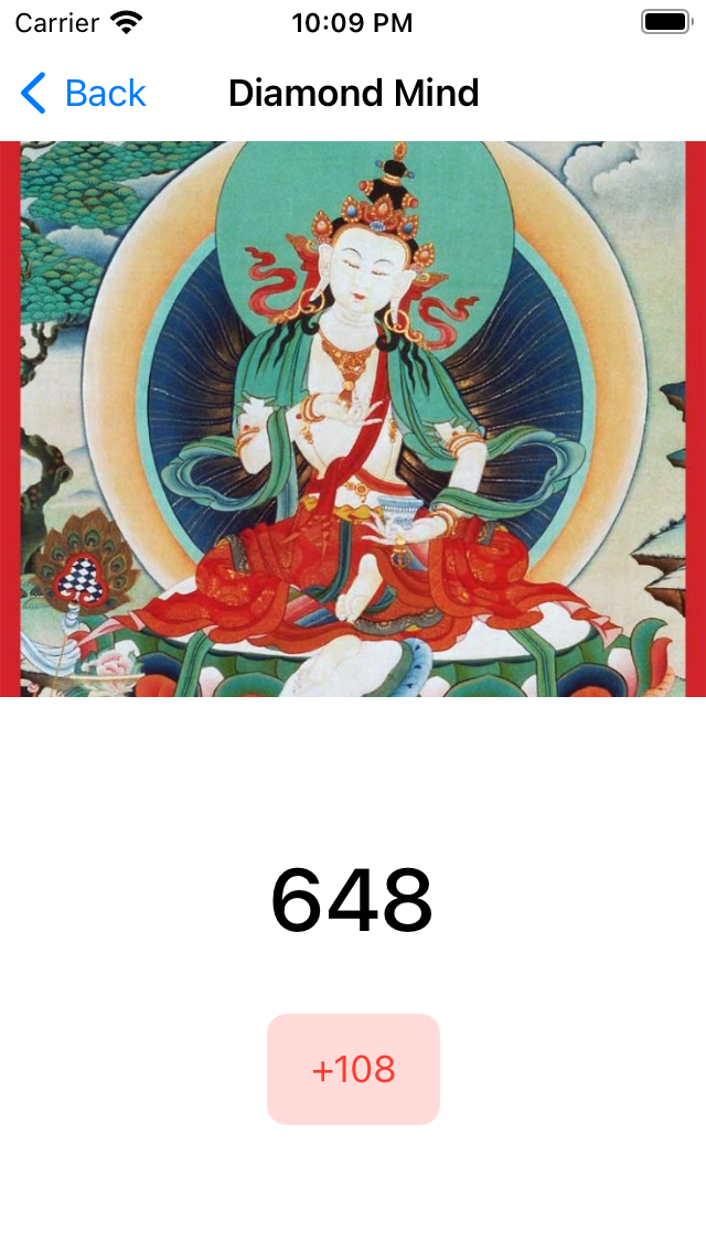 There is also a single practice view, which presents the current amount of repetitions and allows the user to add more to that count. Right now, the user can only add the default amount (108) each time. There is no way to customize the default amount, reset the starting amount, or add a custom amount on a per-practice basis.