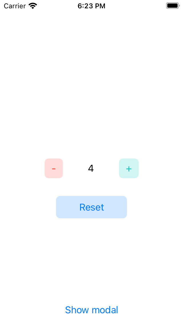There is a counter which can be incremented, decremented, or reset using appropriate buttons. When the user clicks Show modal, a modal sheet is presented, which also has access to the state.