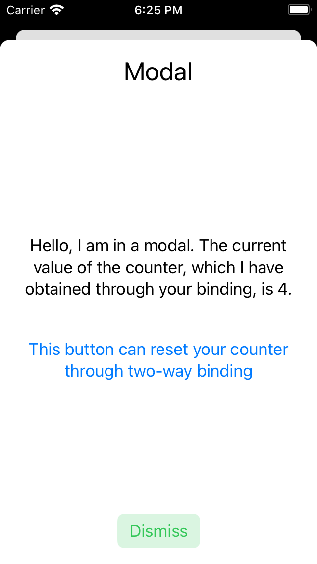 The modal has access to the count by means of a state binding. Since the binding is two-way by default, the modal can reset the value of the counter. The modal can be dismissed by sliding the modal down using the handle on the top or using the green-tinted Dismiss button.