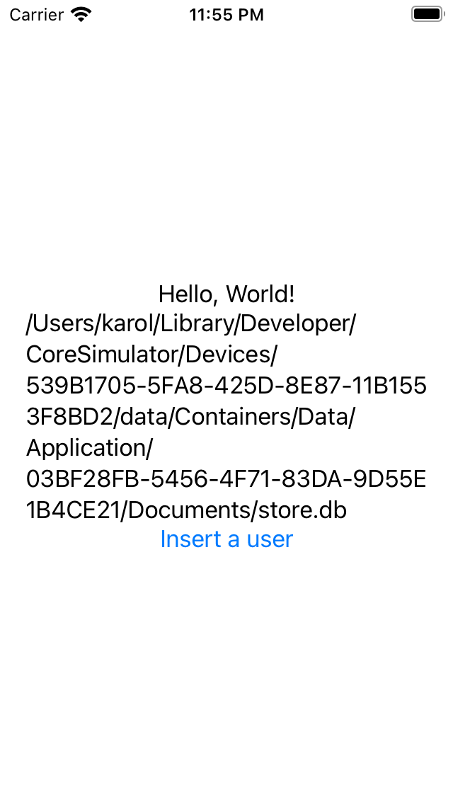 The full path of the database file is printed to the console in Xcode, for each build it’s a different path. If you have TablePlus installed, you can open SQLite database files in this program, otherwise you can use the sqlite3 CLI. This is the database created by this application: :