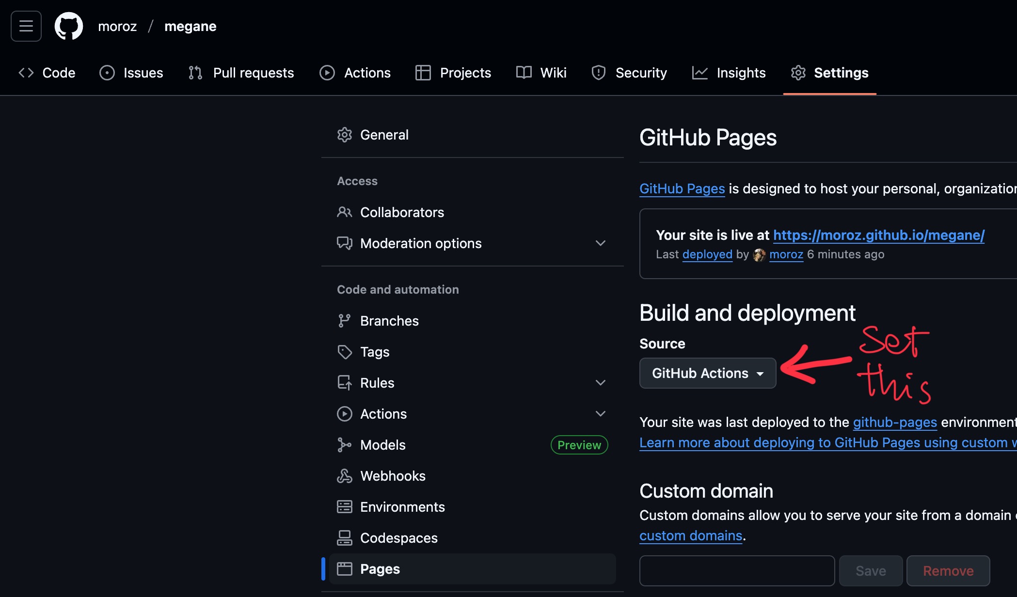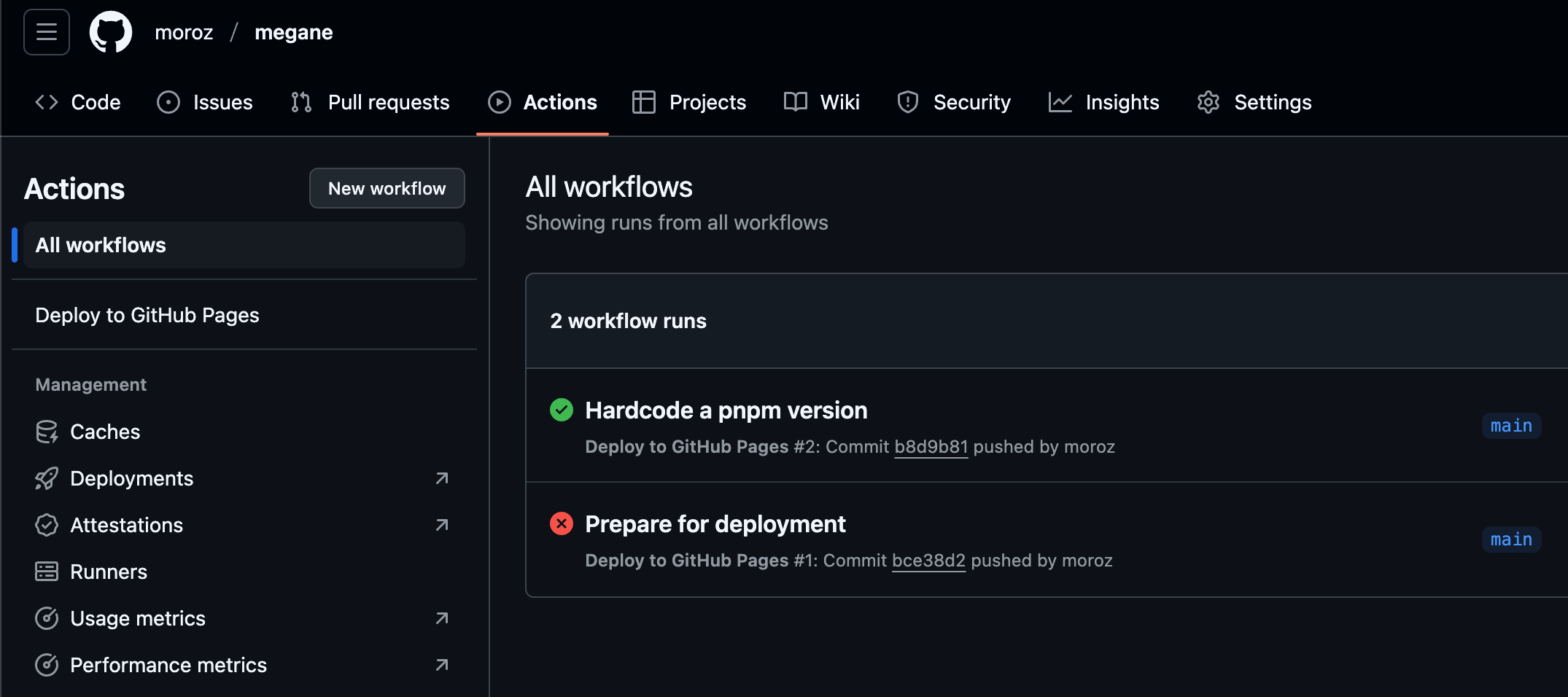 https://github.com/moroz/megane/settings/pagesIn this view, make sure that Build and deployment -> Source is set to GitHub Actions: